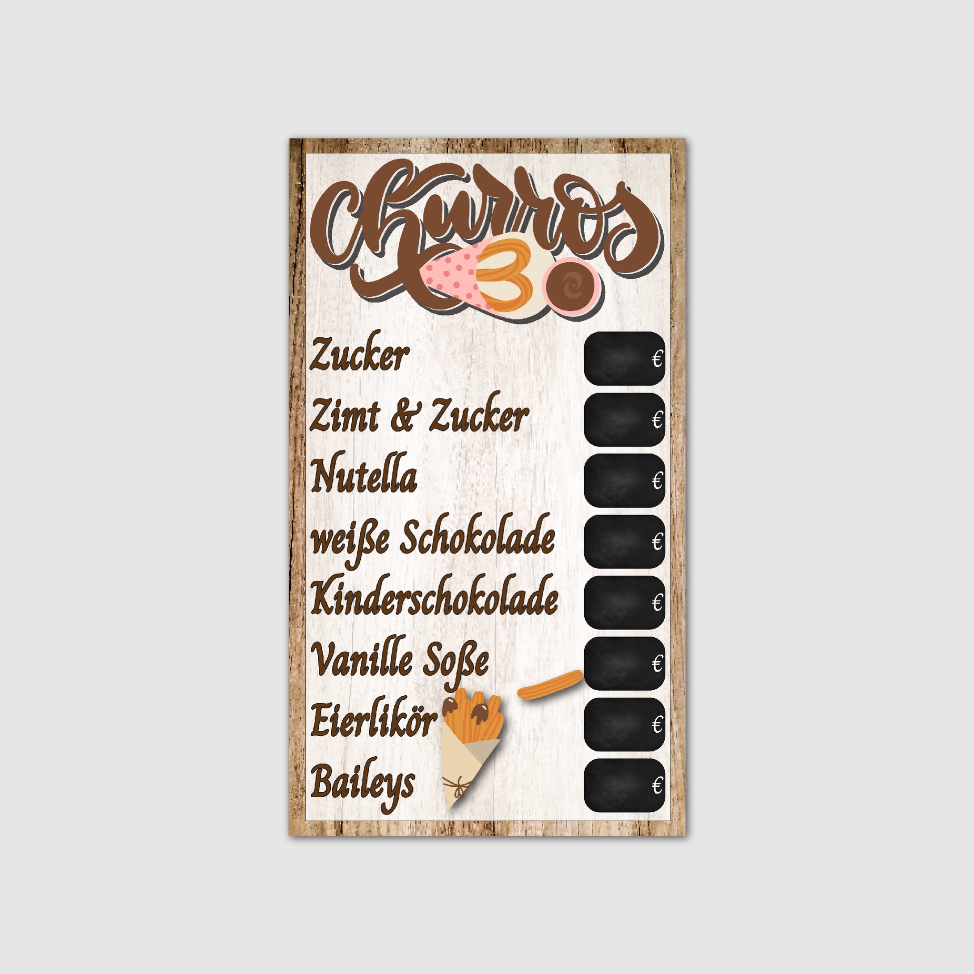 Individuell anpassbar: Passen Sie die Tafel nach Ihren Bedürfnissen an. Fügen Sie Ihre Churros-Spezialitäten, Preise und andere Informationen hinzu, um die Aufmerksamkeit Ihrer Kunden zu gewinnen.