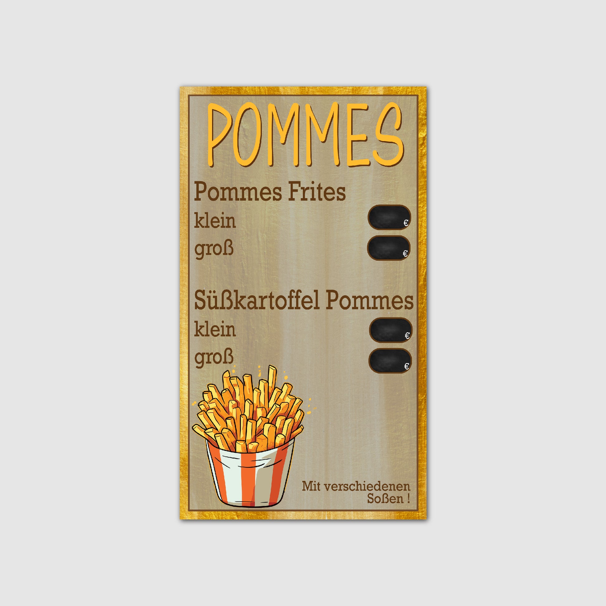 Unsere Preistafel für Pommes ist ein auffälliges und attraktives Element, das in jeden Markt oder jede Veranstaltung passt.
